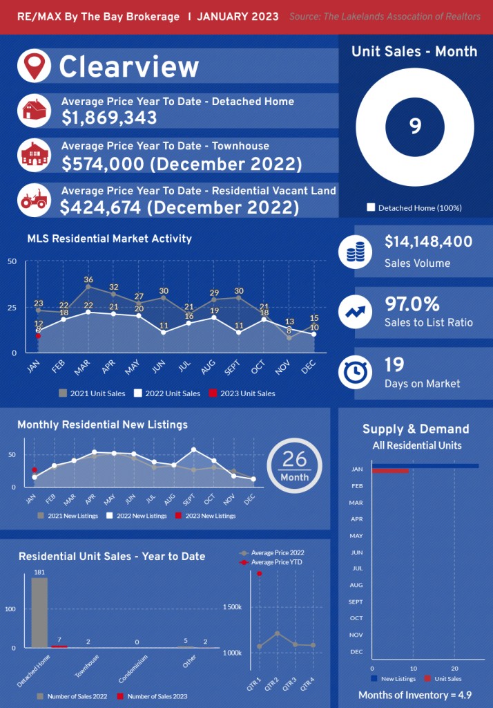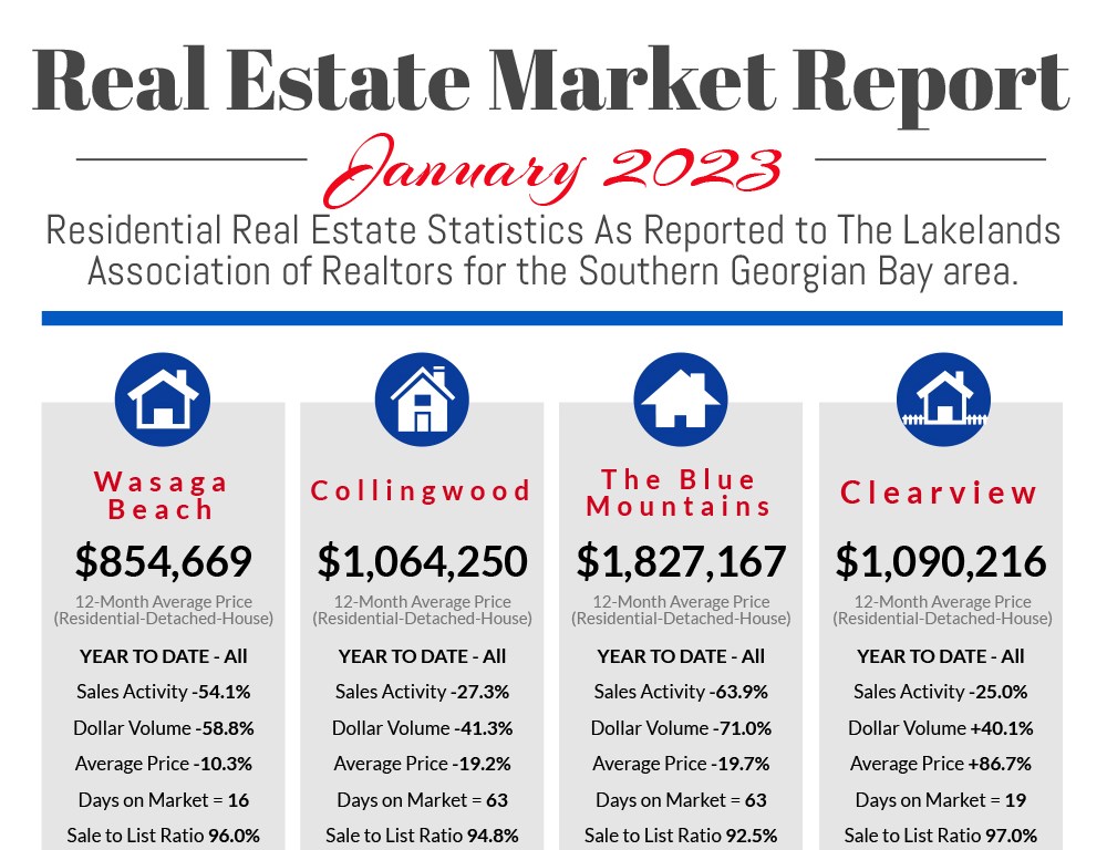 With the sale of 272 Warrington Road in Stayner, the 12-month average sale price for a detached single-family home in Clearview was $1,135,158 in January 2023. This is an increase of +4.68% over an average of $1,084,392 in December 2022. If you manually calculate this average excluding the $9M sale of 272 Warrington Road in Stayner, the new 12-month average is $1,090,216 and represents a +0.54% increase which we believe is a more fair and accurate reflecting of the market (this figure was used in our brokerage report for the 12-month average in the attached reports).