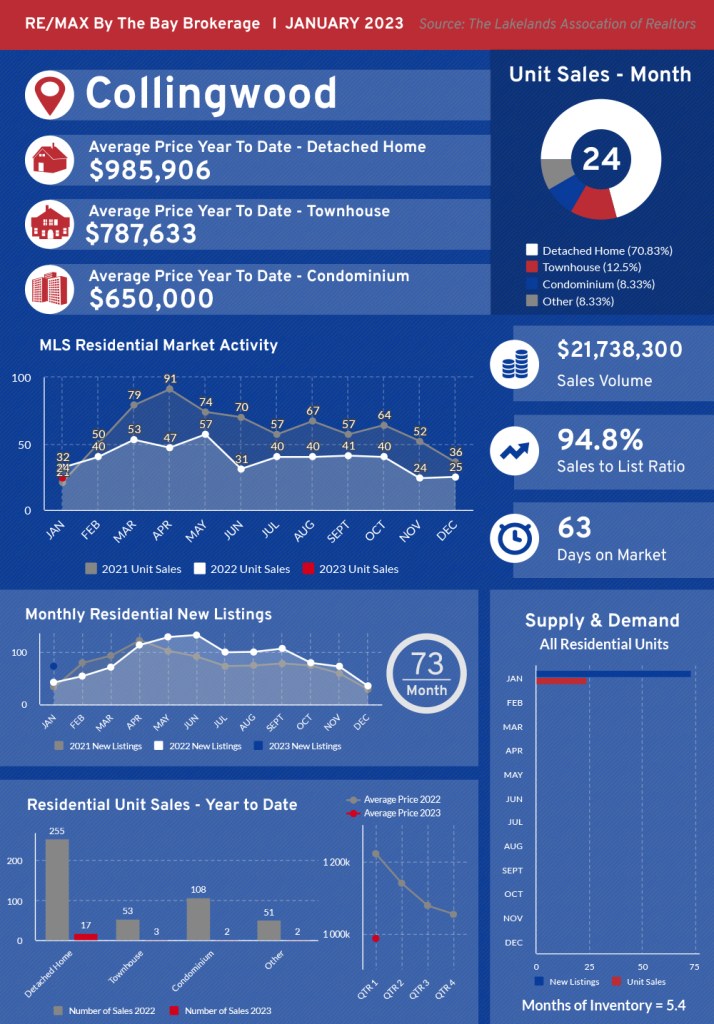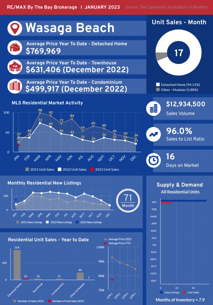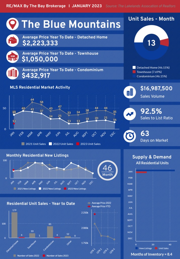 In the Month of January 2023, there was a total of 79 residential unit sales reported in Lakelands West (The Blue Mountains, Clearview, Collingwood, Grey Highlands, Meaford, and Wasaga Beach). The number of sold units is down -42.8% from last year (132 unit sales in January 2022), however, this is only a decrease of -7.06% from the previous month (89 Unit Sales in December 2022).