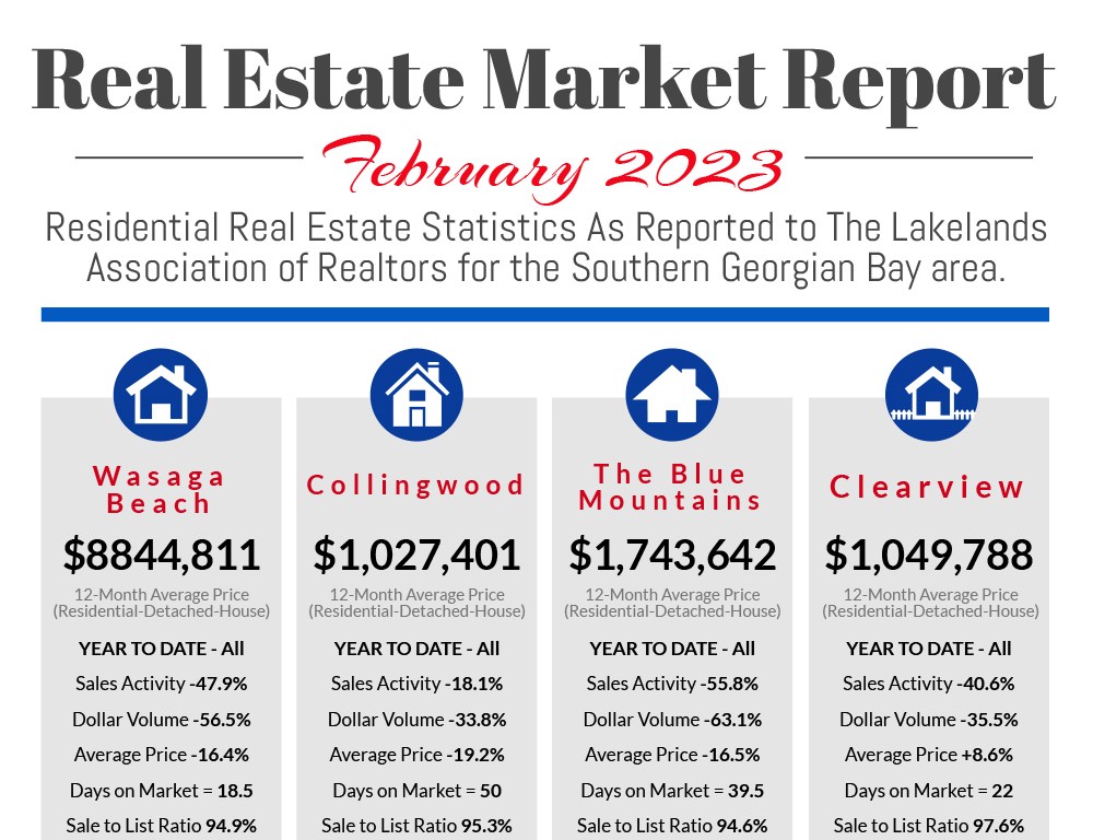 A closer review of the local townships surprisingly indicated that both Wasaga Beach and The Blue Mountains reported an increase in the month and year-to-date average residential sales price from January to February 2023. Although notably both were down slightly based on the 12-month average sales price when you include added past data. Collingwood and Clearview Township reported a decrease in the average sales price based on the month, year-to-date, and 12-month average sales price. With only 2 months into the new calendar year, it is difficult to use the month and year-to-date averages as they are based on a lower number of unit sales. The statistics are based on an average of “what has sold in that time period” as opposed to a true reflection of the overall market. Added time as we approach the end of the first quarter will help provide a more accurate reflection of 2023 year-to-date.