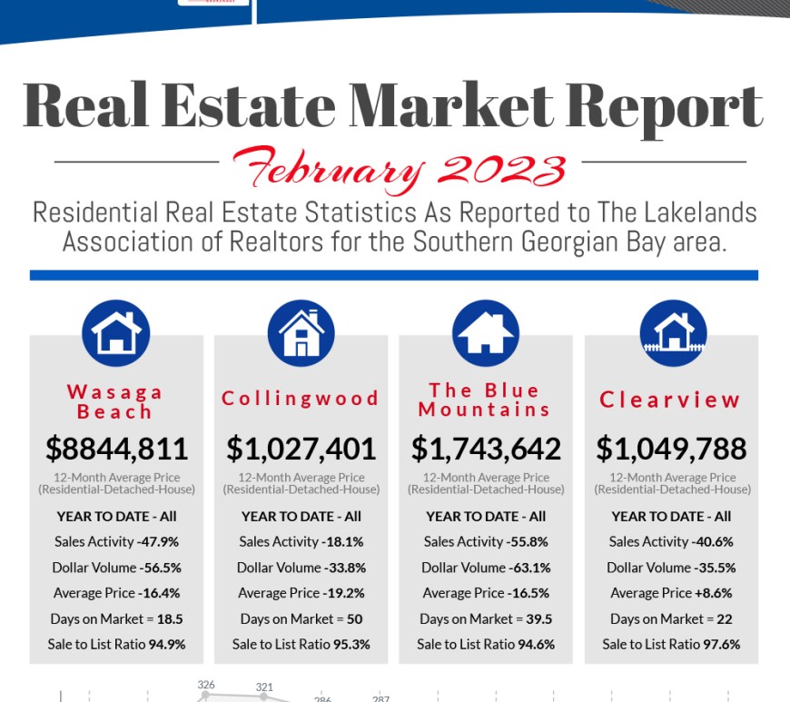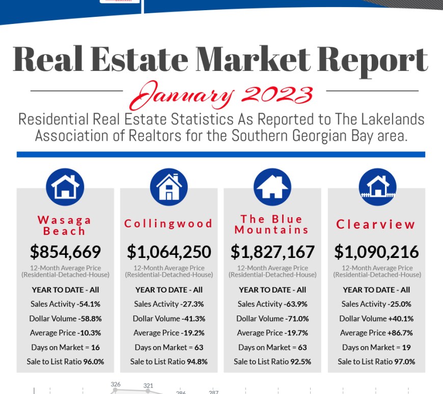 Sales Activity: In the Month of January 2023, there was a total of 79 residential unit sales reported in Lakelands West (The Blue Mountains, Clearview, Collingwood, Grey Highlands, Meaford, and Wasaga Beach). The number of sold units is down -42.8% from last year (132 unit sales in January 2022), however, this is only a decrease of -7.06% from the previous month (89 Unit Sales in … Continue reading Market Report – January 2023